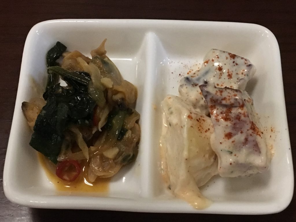 お通しはアサリのピリ辛漬け的なのとタコとジャガイモのガーリックマヨネーズ和え。