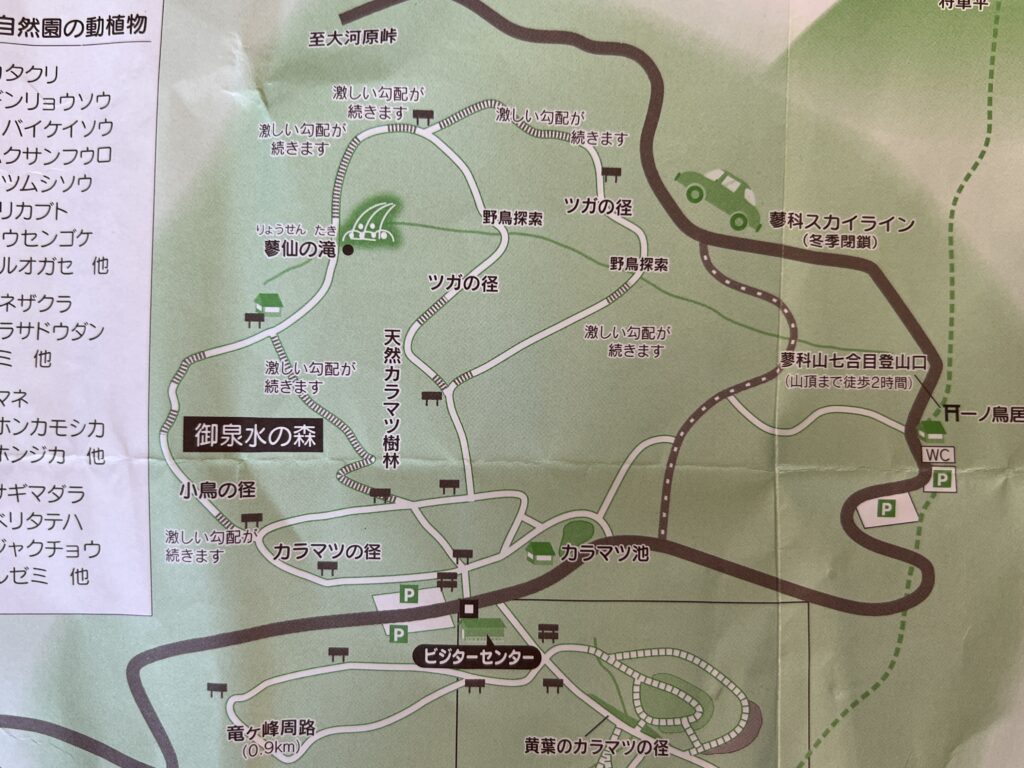 駐車場は2か所あり、手っ取り早いのは御泉水自然園ビジターセンター横の駐車場です。