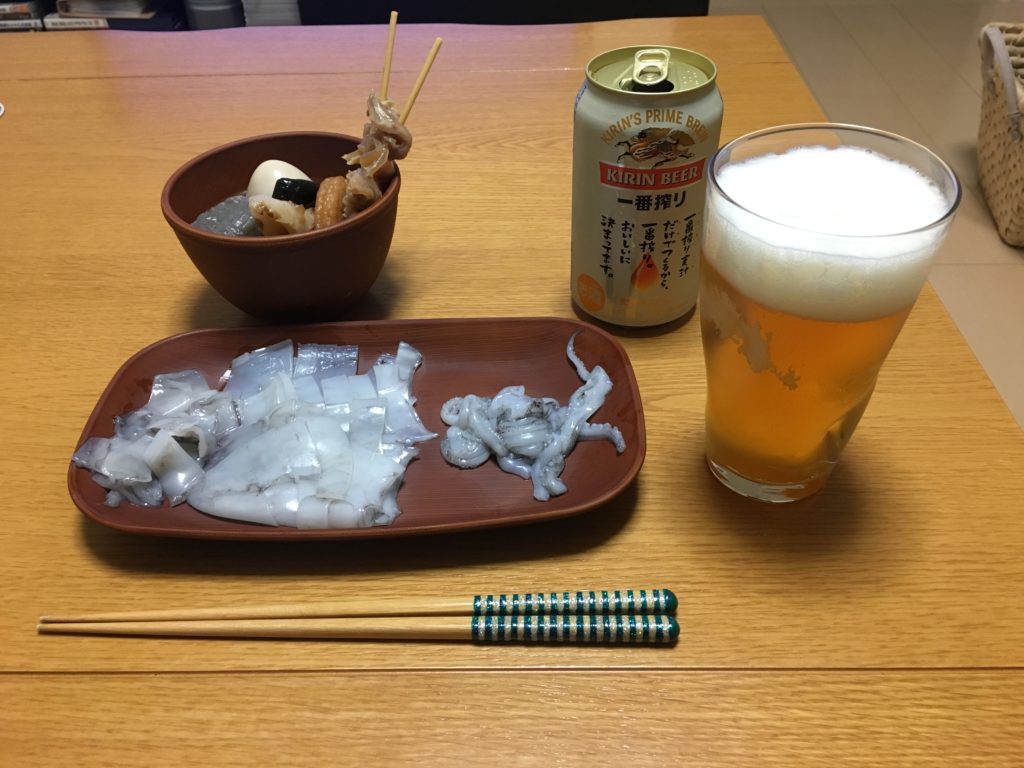 アオリイカの刺身とおでん。ビールを合わせて最高!!
