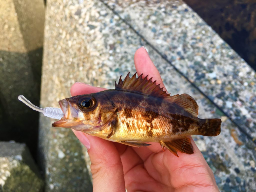 タックルを一新して最初に釣れたのはキビキビダートジグヘッドで、かわいらしいメバルでした。