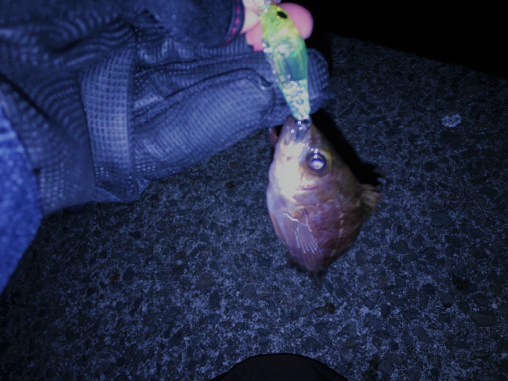 常夜灯が効き始め、水面がパシャパシャと賑やかになっています。おそらくメバルがベイトを捕食しています。明るいうちにメバルのベイトは確認済み。5センチに満たない小魚でした。
