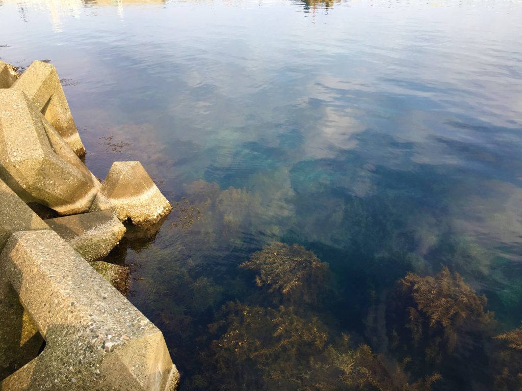 まだ明るいので、釣りはそこそこに漁港全体を探索。適度に海藻も生えており、チビメバルがチラホラ。姿が確認できて一安心。