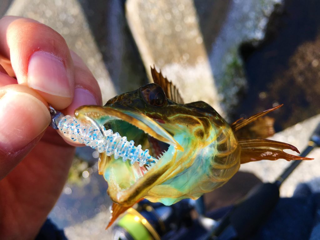 今回はダートジグヘッド1グラム+アジリンガーのクリアーで動きの釣りを展開していきます。ベイトは昨日の漁港と同じ小魚。完全にマッチしている証拠に小魚がアジリンガーの後を付いてきます(笑)