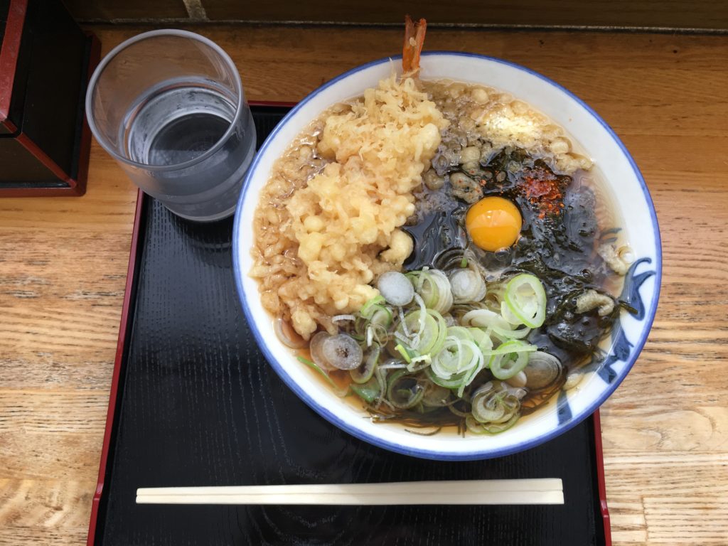 歓喜の朝食。もずくそばにエビの天ぷら添え。直江津駅にて。