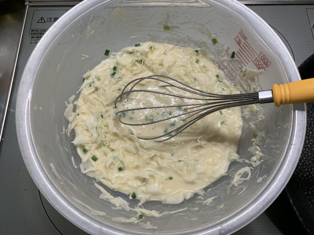 このあとは粉・だし汁・キャベツ・ネギを混ぜ、