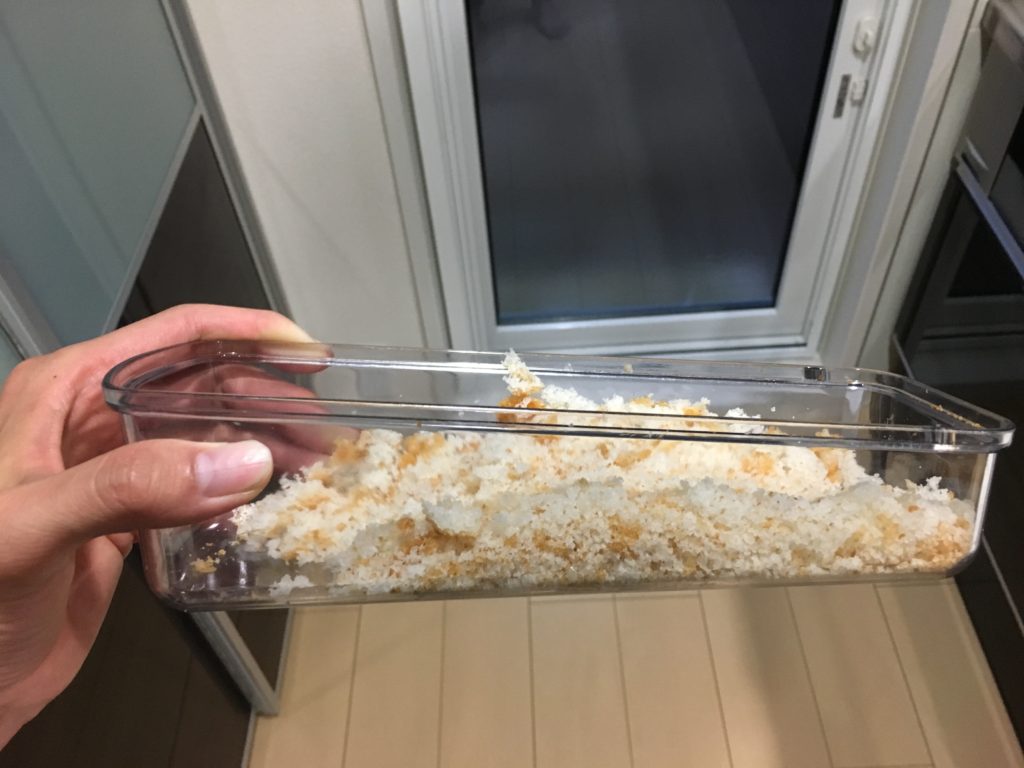 最初は削っていたのですが、手で崩した方が早くできましたので、最後の方は結構荒々しいパン粉になりました。