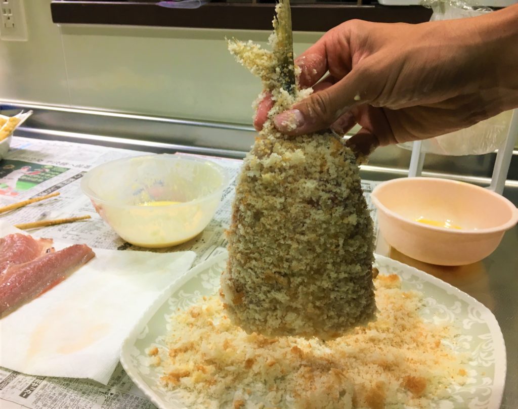 フライの正しい手順と言えば、粉→卵→パン粉ですが、今回は粉→卵の過程はてんぷら粉で代用。