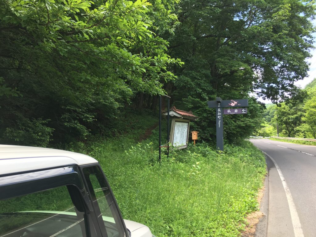 ここから100mほど走った左側に仏岩の登山口があります。そこには駐車スペースになる広場がありますので、そちらに車を停めていきます。