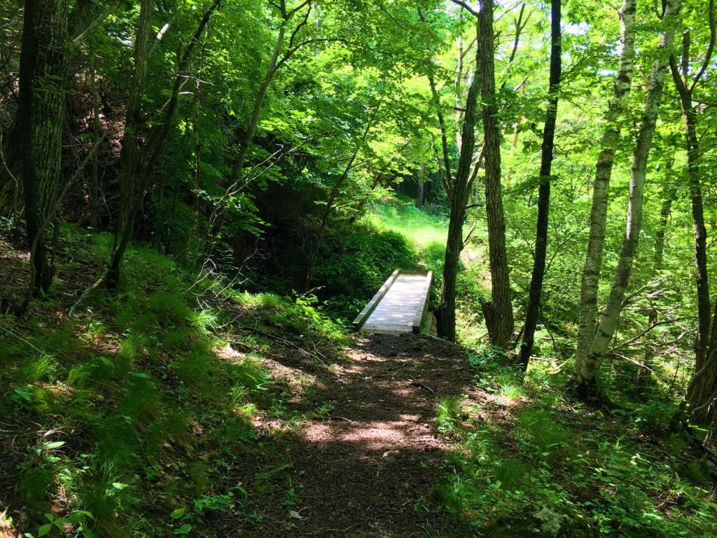 歩き始めて5分程度で木の橋が出てきます。初めて登る場所だと人造物が出てくると少し安心します。