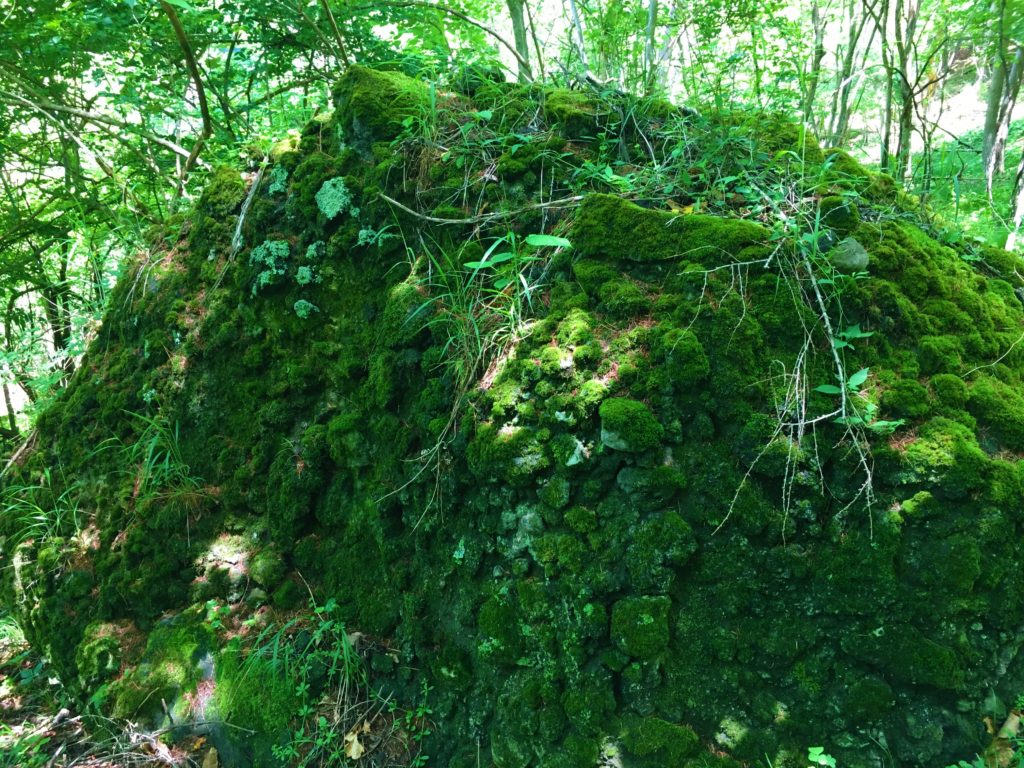 岩の上に乗った石にまで苔が。石は重なっており、何かしらの意味を成しているのか?
