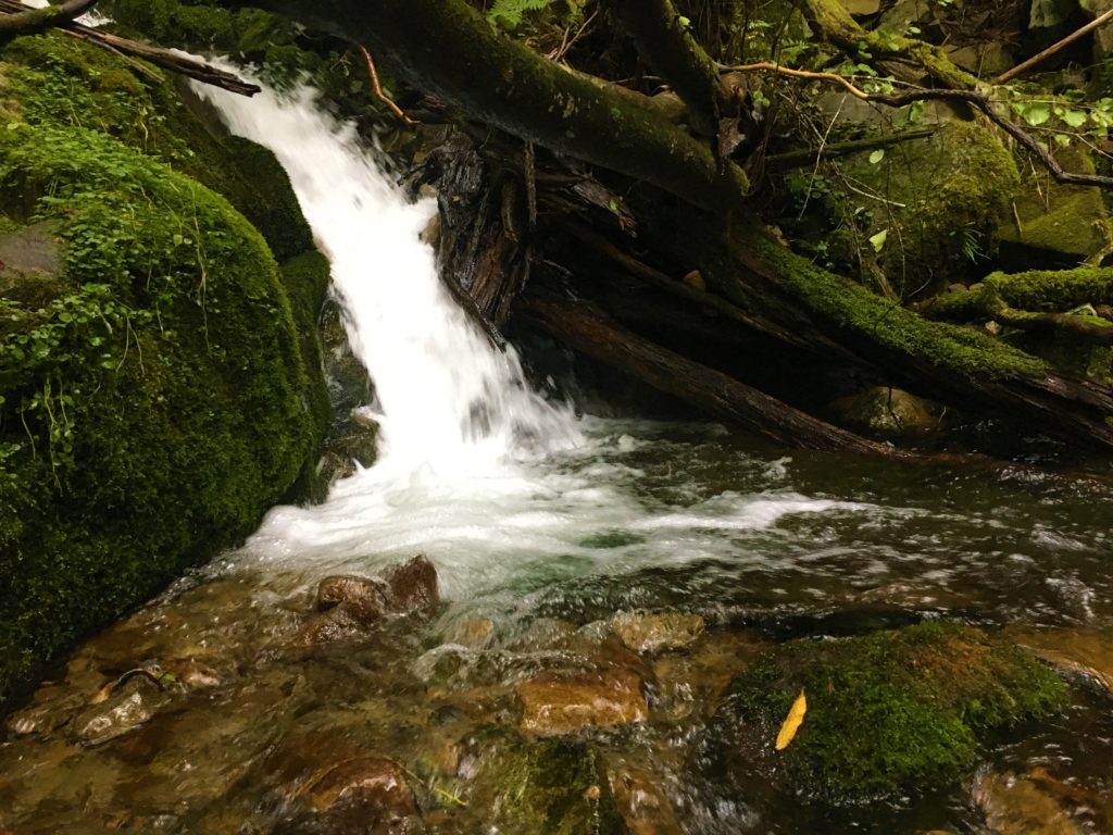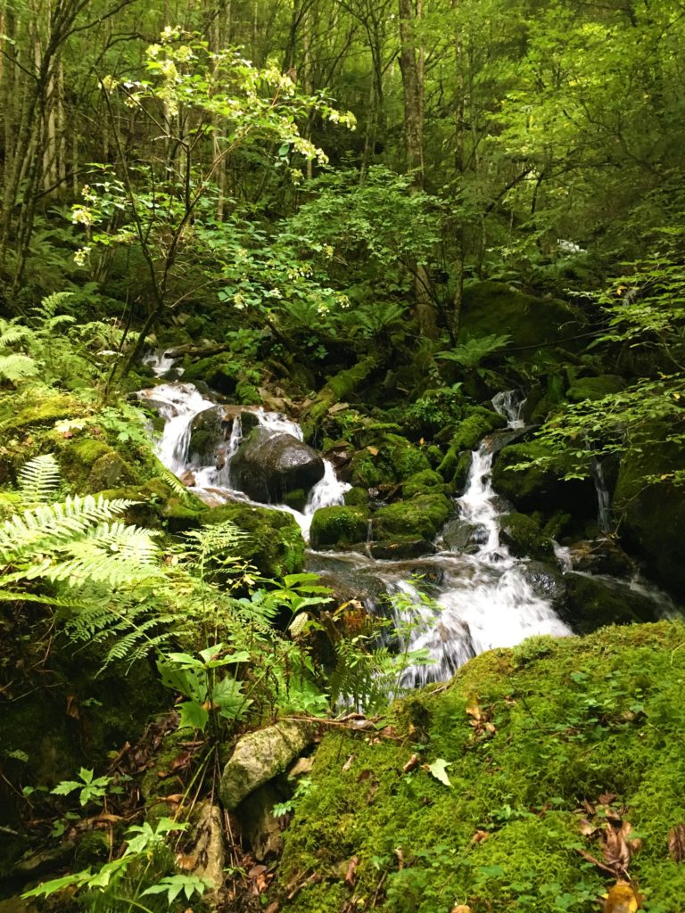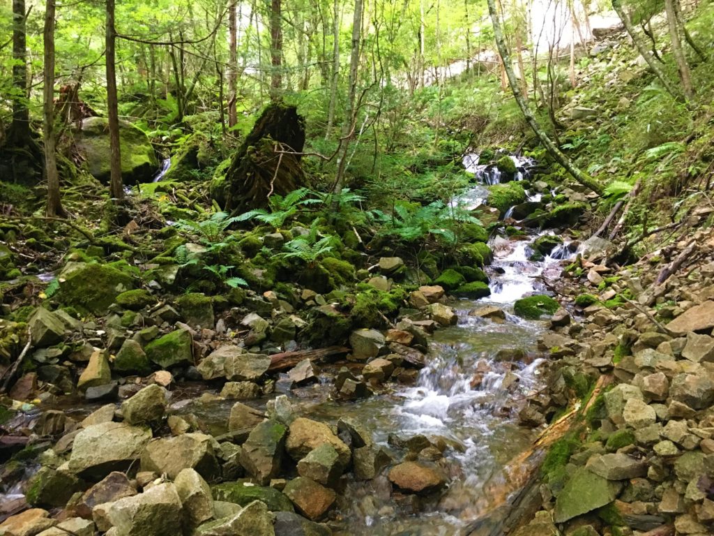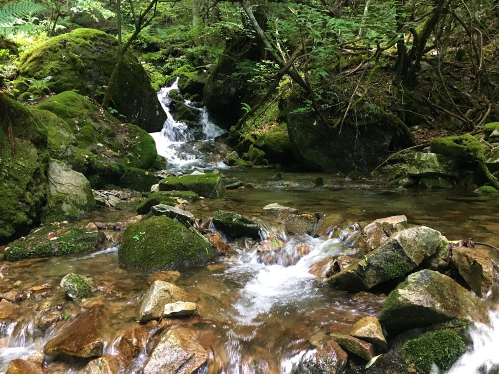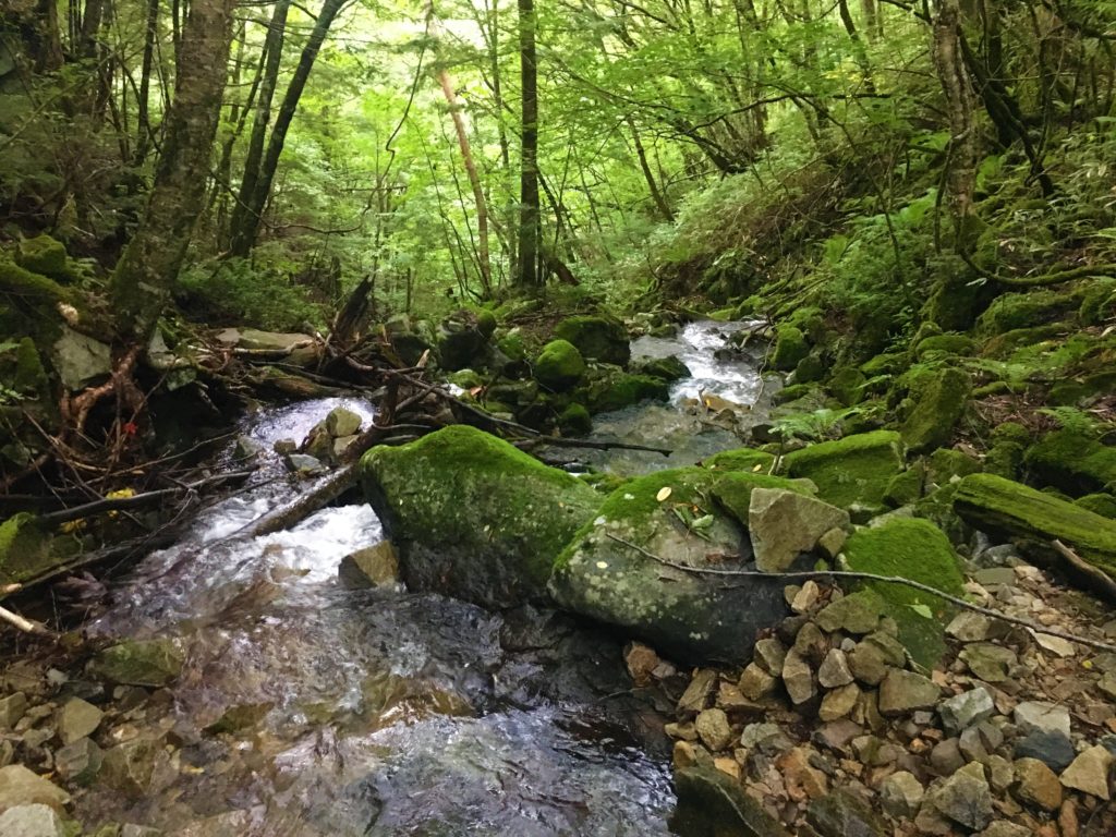 1mほどの川幅。適当に歩くと足元からイワナが逃げていく。