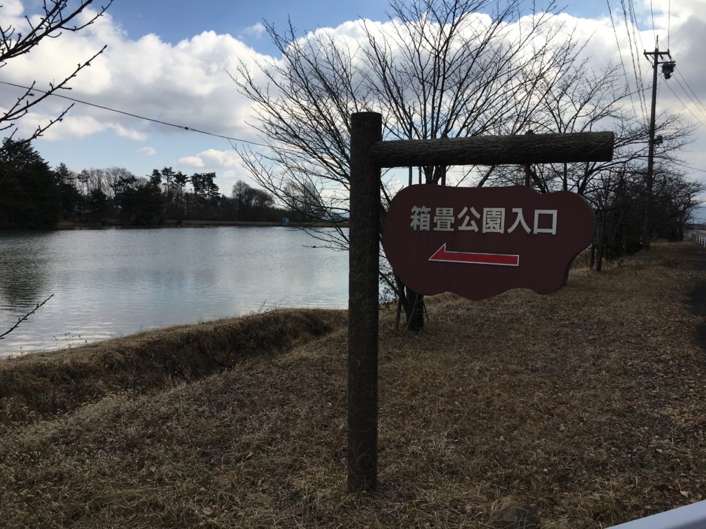 峠道を抜け、山のてっぺんに差し掛かると箱畳池の看板が出てきます。