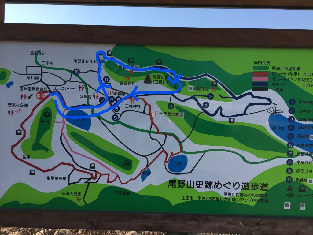 今回歩いたのは地図に示してある青コースを短縮したコースです。