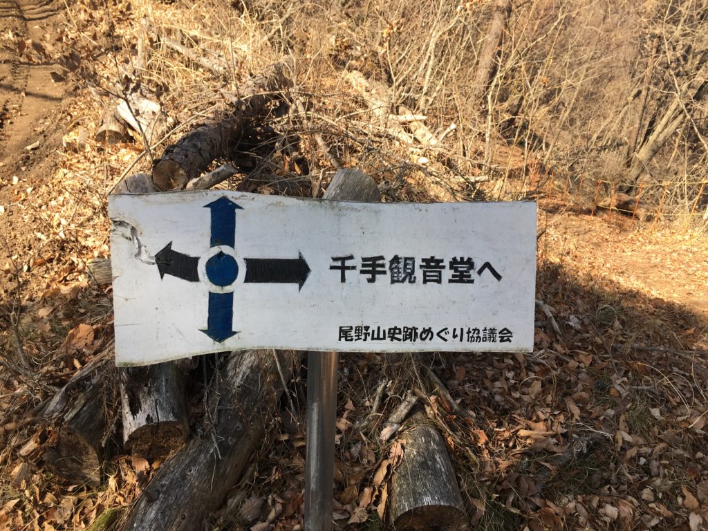 僕は下矢印方向から来ているので、まっすぐ進むのが「尾野山史跡めぐり」のコースに当たるのですが、先が長いため「千手観音堂へ」の方向へ向かいます。
