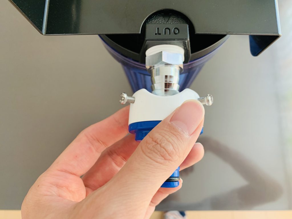 まず、パチット蛇口のネジがついている方を浄水器の「OUT」側に装着します。