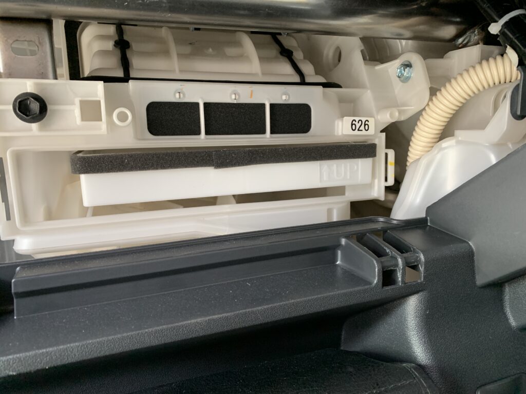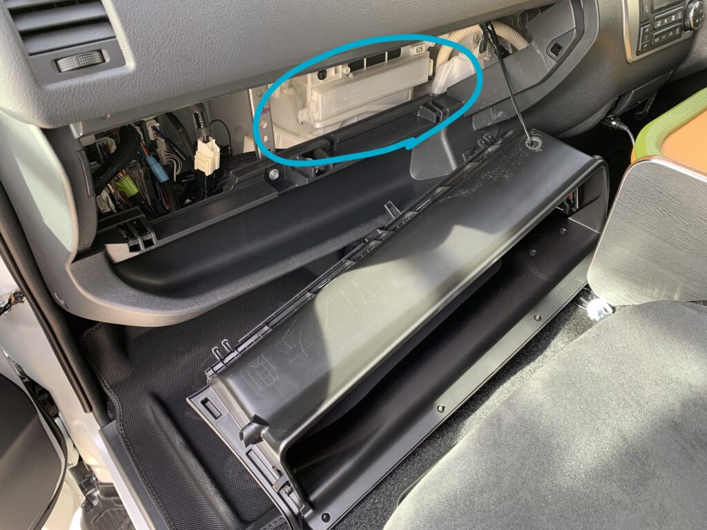 まずは助手席の正面に付いているグローブボックスを外していきます。
