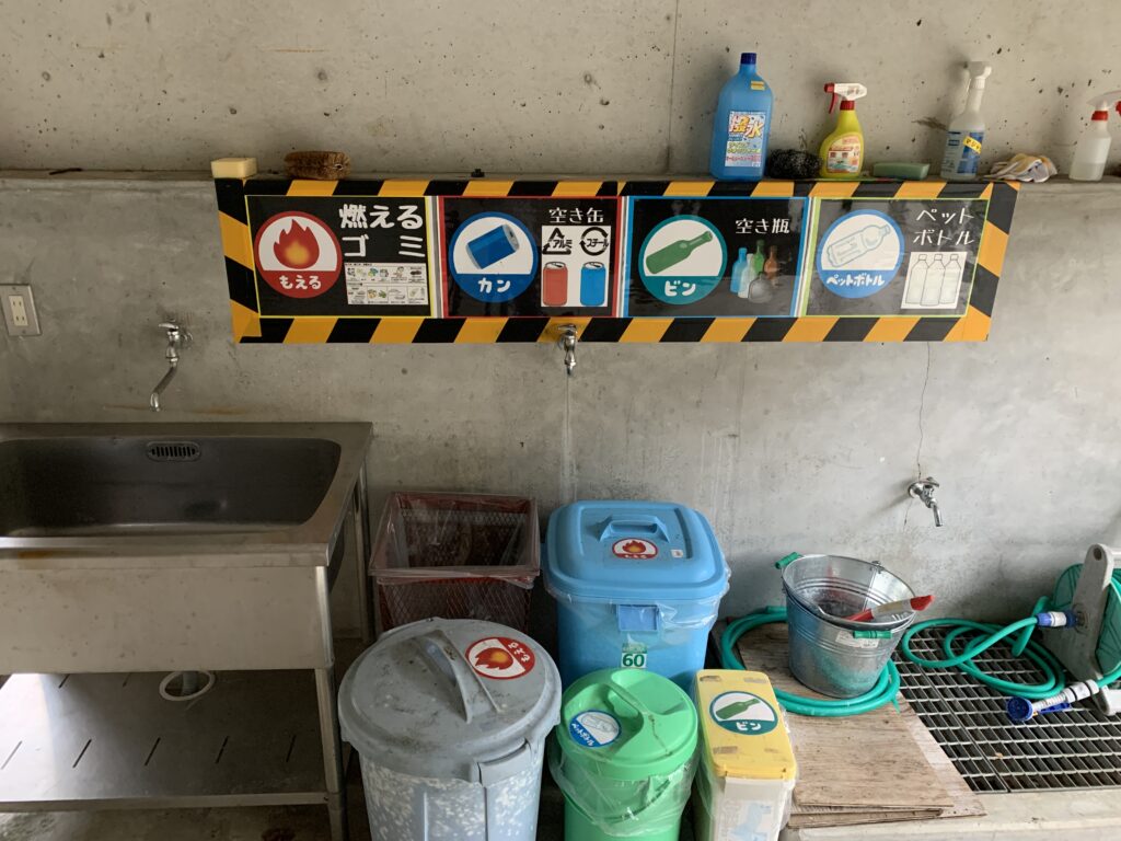 写真中央の建物地下の空間に水道・ゴミ捨て場があります。