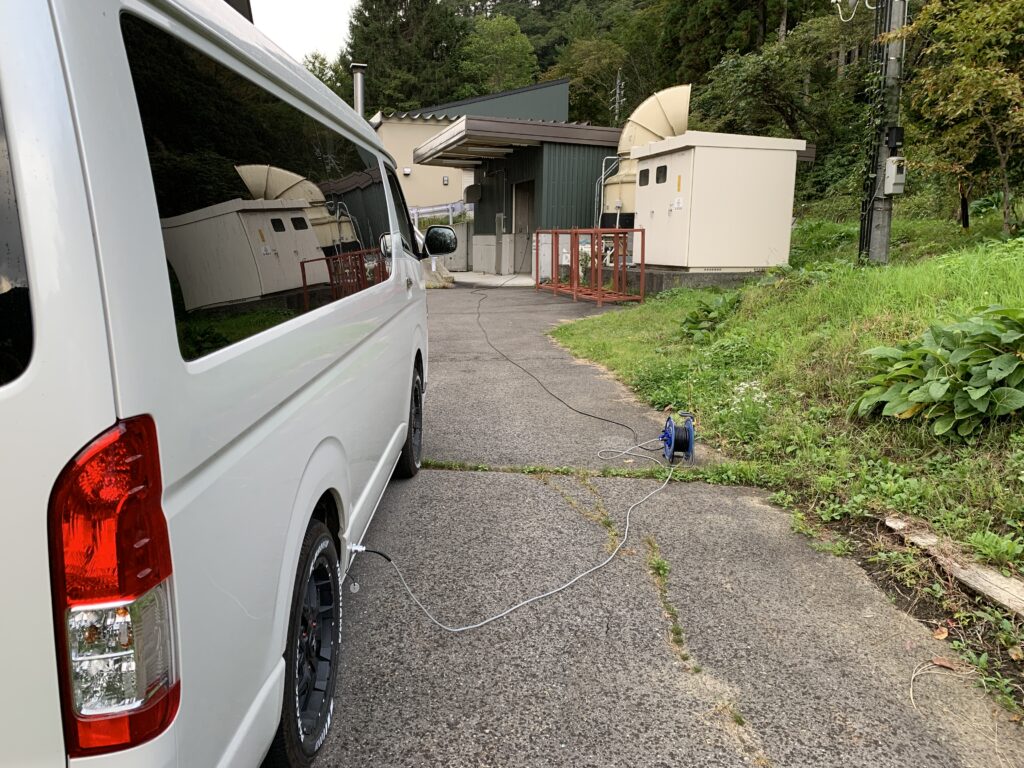 電源はリールを使って車付近まで持ってきます。