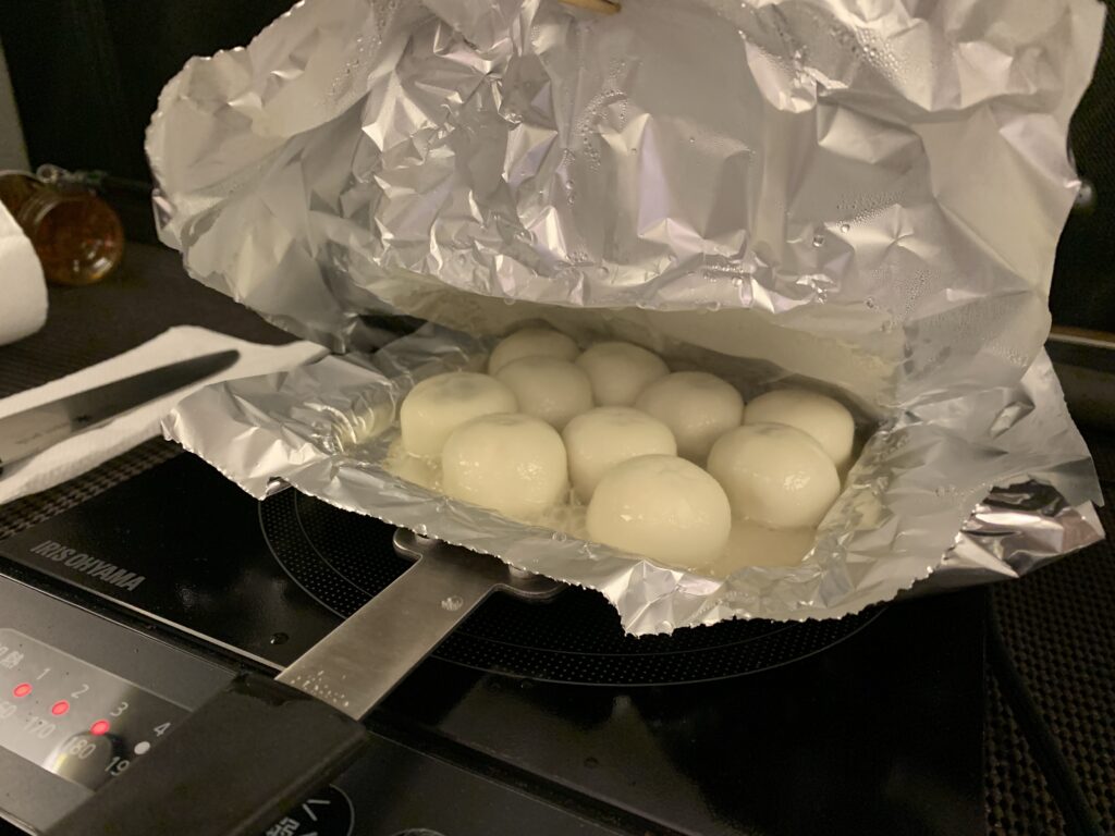 ホットサンドメーカー+アルミホイルで油が飛ばないよう調理。