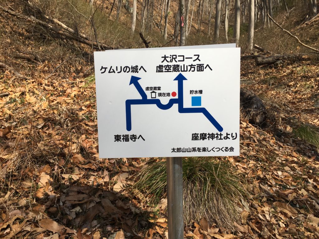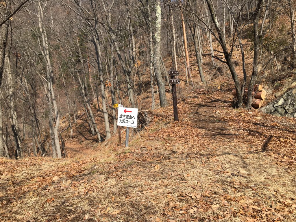 ここから虚空蔵山を目指すには「兎峰を通るコース」か「大沢コース」があります。僕らが行く虚空蔵堂は「大沢コース」方面にあります。ですので、白い看板が指し示す左側に進んでいきます。
