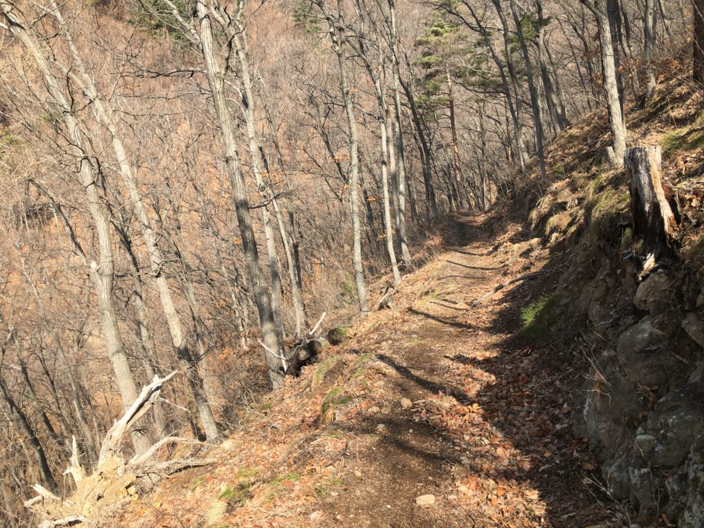 先ほどまでは車が通れるほどの道を歩いていたので、ずいぶん狭く感じました。でもこの辺までは人が歩いた跡があるので安心して歩いて行けます。