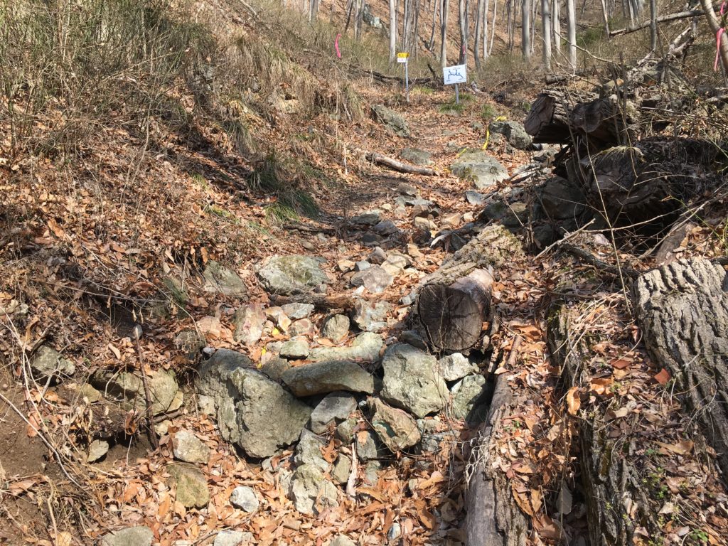 なんとなく川底だったように岩が並んでいました。結構ぐらぐらしているので歩くときは気を付けないといけません。ていうか、先に看板が見えなければ歩く気にならないようなところです(笑)岩ゴロゴロだし、急坂です。