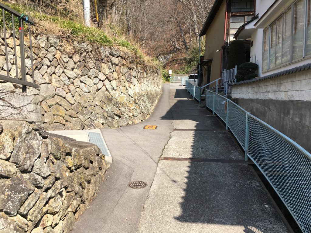 階段を降り、少し歩くと家々の間の道に出ます。