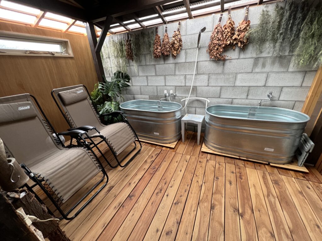 外気浴も同じスペースでできるので、身体を拭いたらすぐコールマンのインフィニティチェアで思う存分ゆ寛ぐことができます。