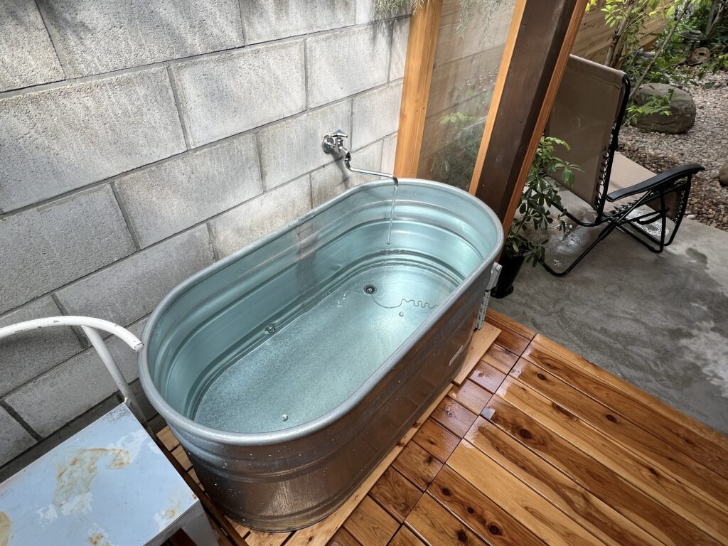 オシャレな金属製のバスタブに水をたっぷり溜めて、体を一気に冷まします!