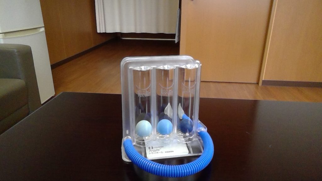 呼吸練習器になります。ホースの先を加えて息を吸うことで中の玉が持ち上がります。思いっきり吸えばいいというものでもなく、左端の玉だけ持ち上げたり、左端と真ん中を持ち上げるようにするなど調整しながら吸います。手術後の呼吸にかかわってきますので、時々練習するように指導を受けました。入院中も練習します。