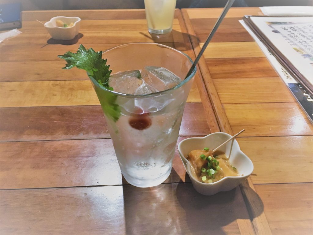 日本酒とトニックウォーターのカクテルに大葉と梅干がアクセントで入っています。