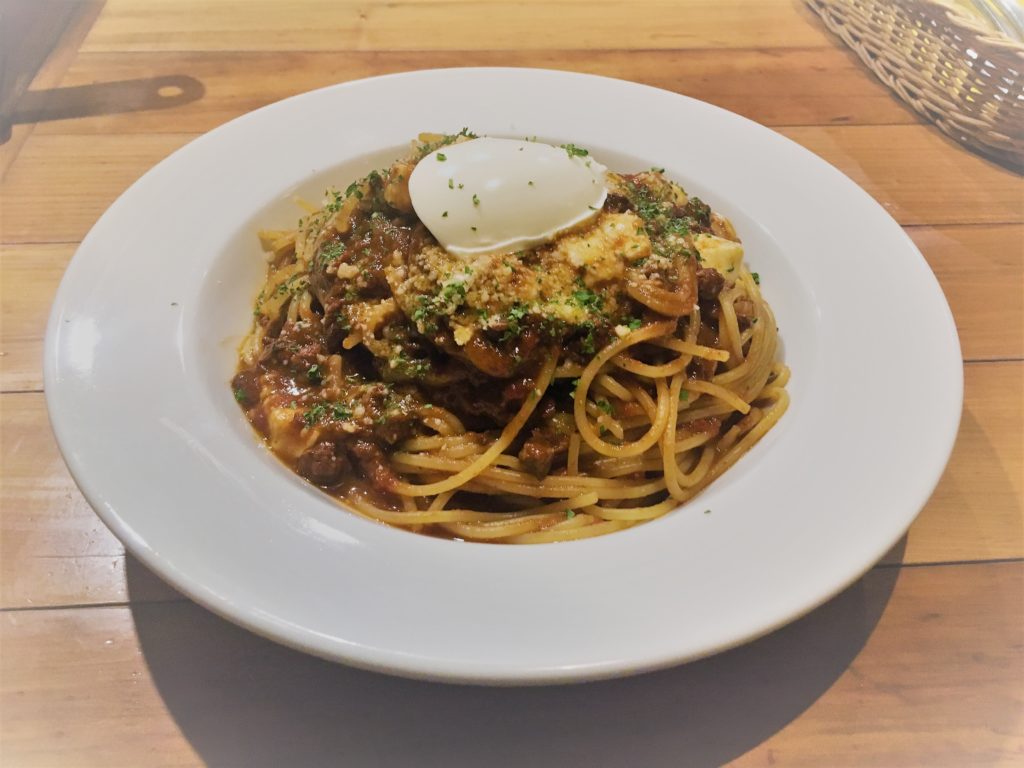 このミートソースはひき肉が粗びきで大きく、食べ応え抜群。