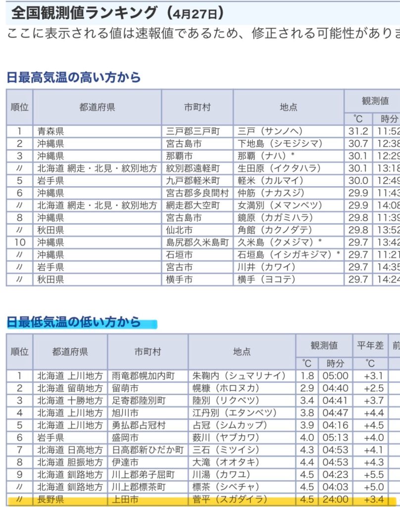色々調べていると4月下旬の最高気温・最低気温のランキングが面白いことになっていたのでブログにしてみました!