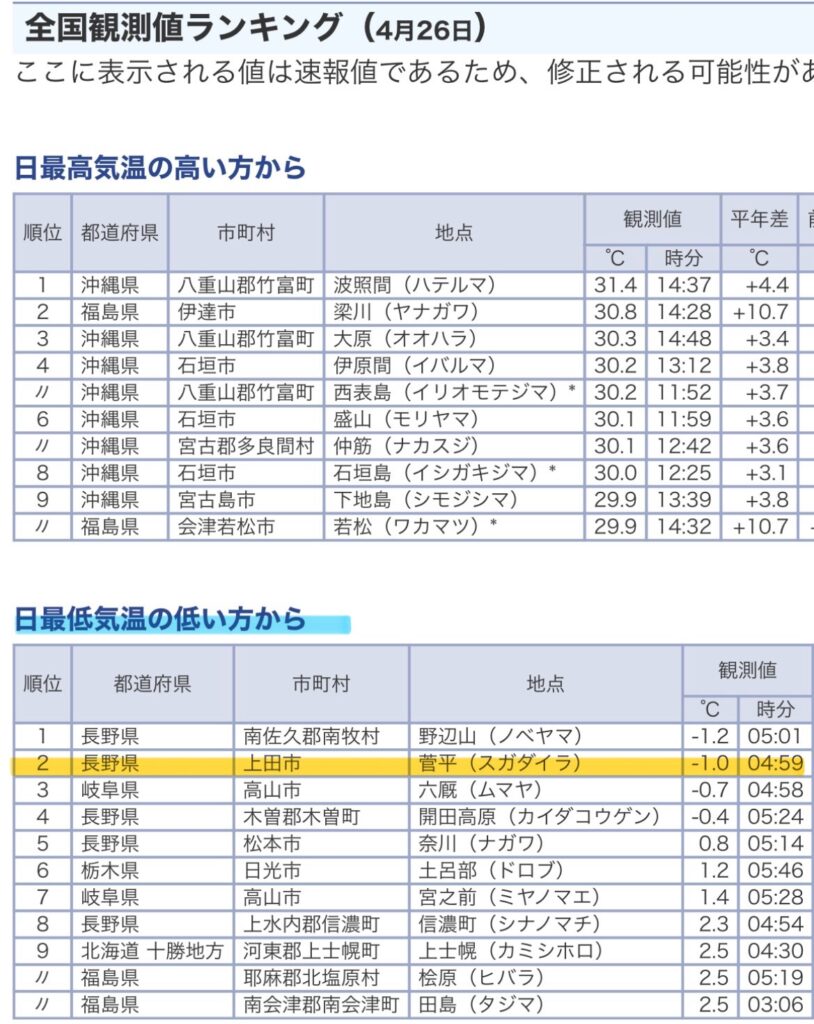 この日の福島県伊達市の気温にも驚きですが、沖縄に挟まれて3位に入ってきた上田市もなかなかのものです…。