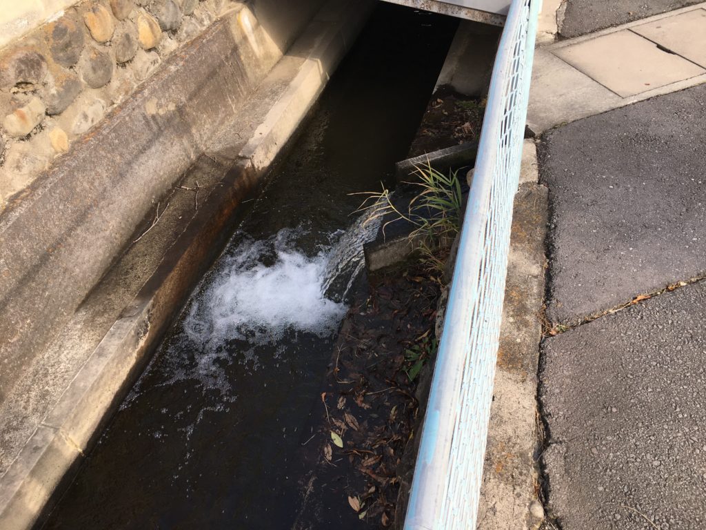 押出川とホタル水路が交わるところ。ホタル水路は細くても水量が豊富。