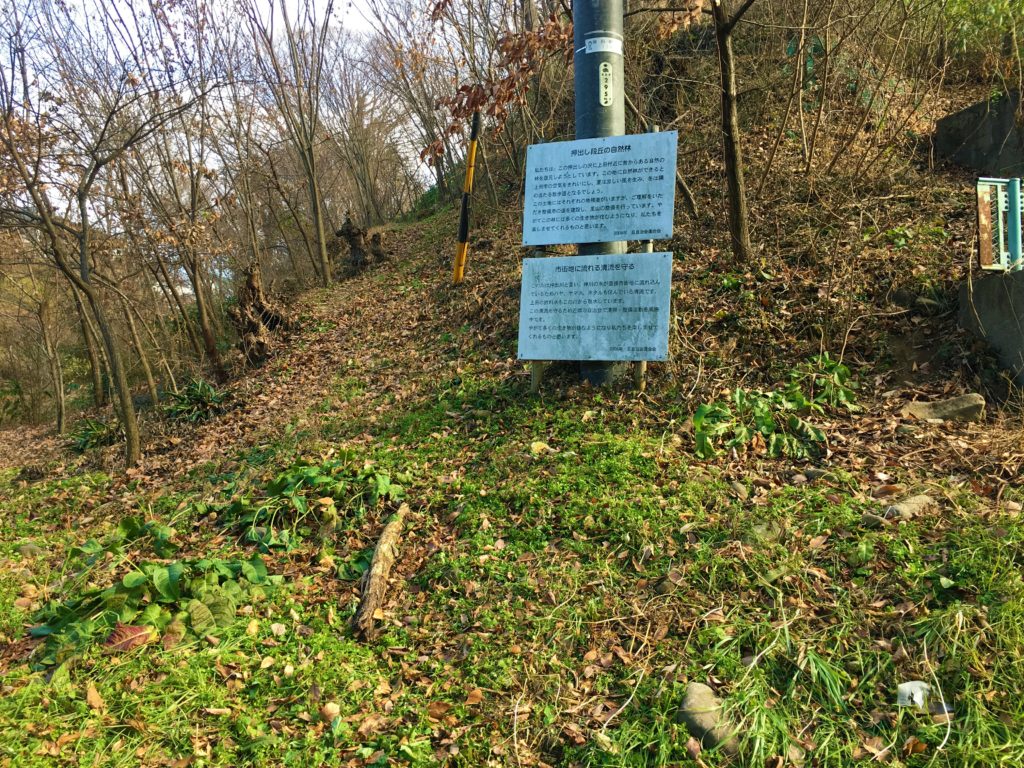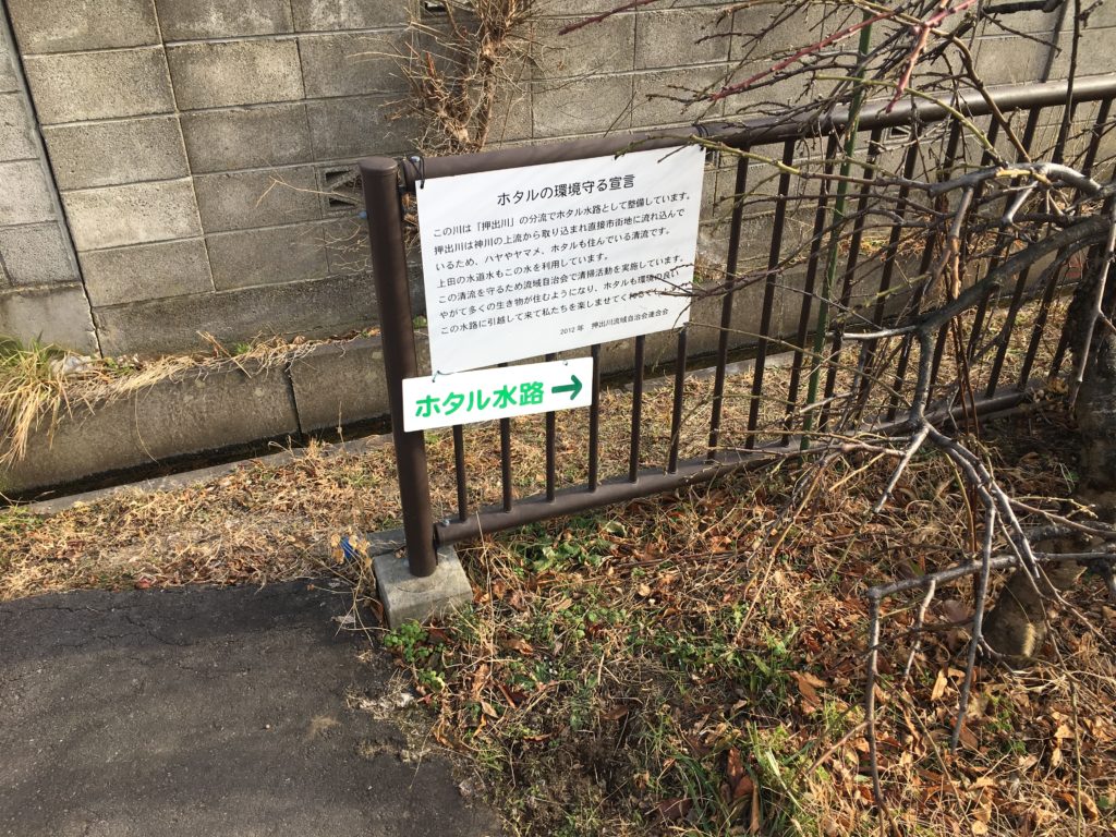 少し歩くとホタル水路の看板が出ます。