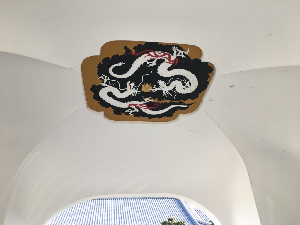 上の写真、門の奥に白い建物があります。その天井には立派な龍が描かれています。
