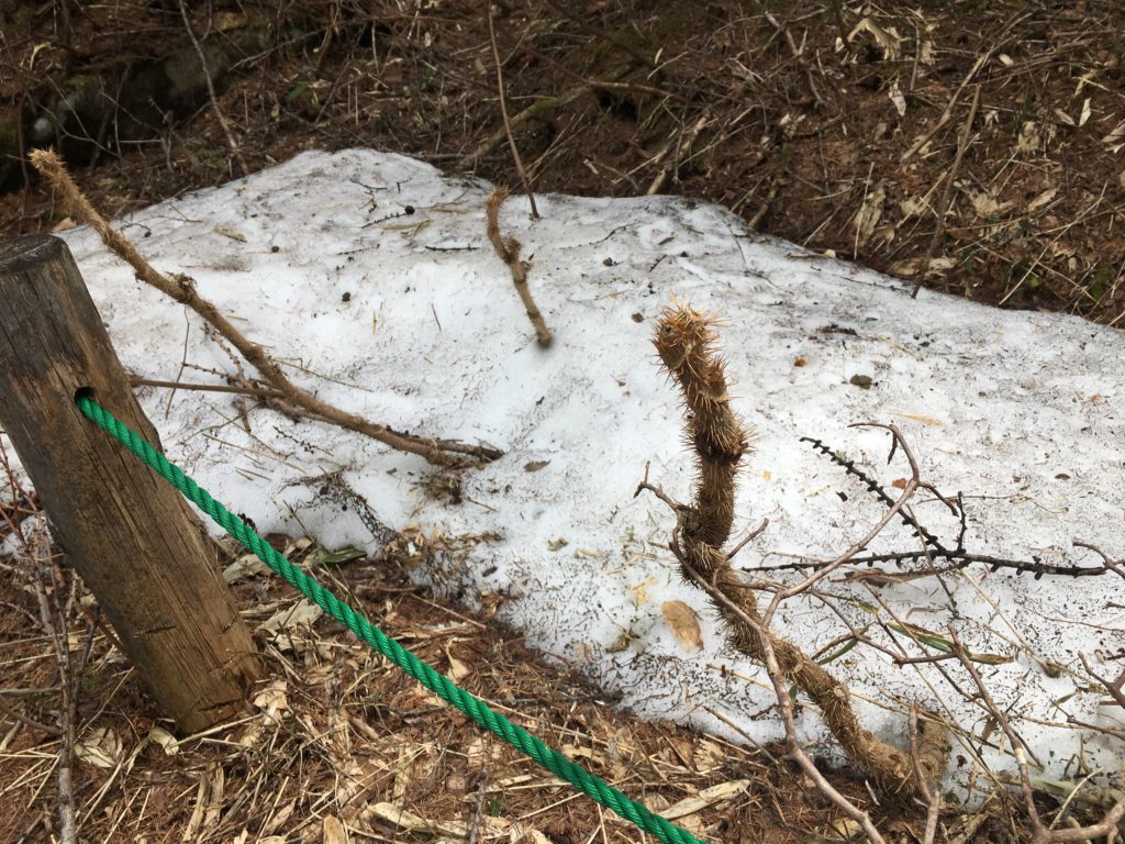 雪の中からとんでもないトゲトゲの木が。超強力なタラの木のよう。