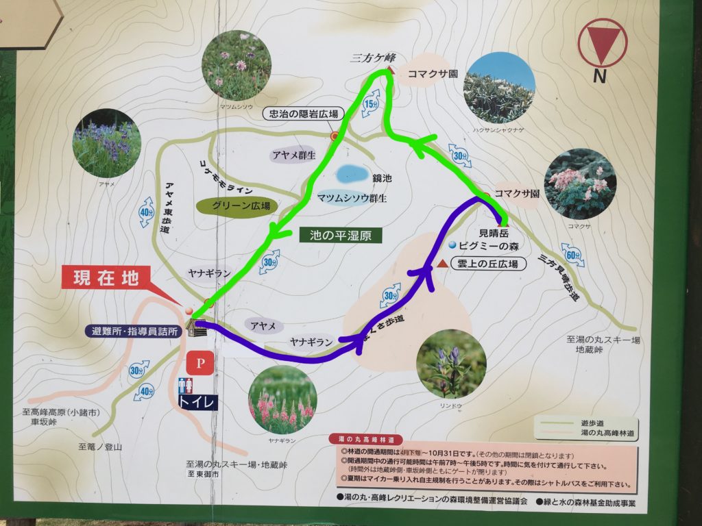 字が消えてしまっていますが、こまくさ歩道を通り見晴岳へ。そこから三方ヶ峰を経由し、鏡池を横目に木道から駐車場へ戻ります。